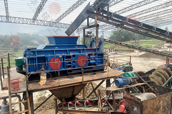 對輥破碎機通過輥輪進行破碎作業。物料由進料口進入輥子之間,通過擠壓作用破碎河卵石,兩輥輪之間有一定的間隙,兩輥輪間隙變大,物料出料粒度變大,在壓緊彈簧的作用下兩輥輪間隙變小,出料粒度變小。通過改變調整間隙,可以控制物料的出料粒度。